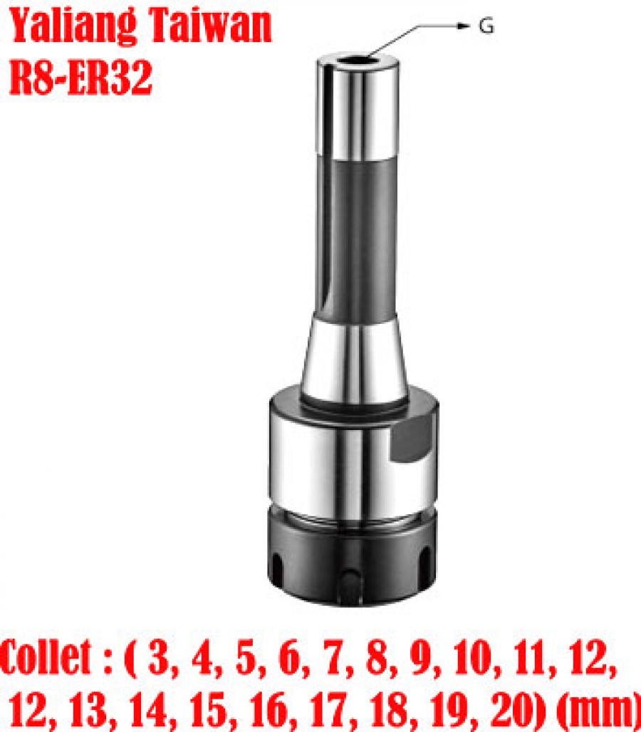 Chuôi cán dao máy khoan phay R8-ER32 Yaliang Đài Loan sử dụng Collet k5p rời với nhiều Size khác nhau. Đay là phần đuôi cán thích hợp cho các loại máy ta rô, máy khoan, máy phay có lỗ côn trục chính theo chuẩn R8, phần kẹp dao chuẩn ER32.