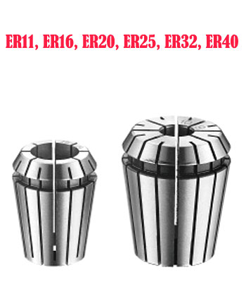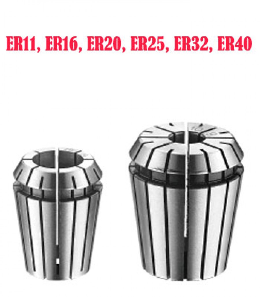 Các loại Collet thông dụng gồm có ER-11 ( 1, 2, 3, 4, 5, 6, 7) (mm), ER-16 ( 1, 2, 3, 4, 5, 6, 7, 8, 9, 10) (mm), ER-20 ( 2, 3, 4, 5, 6, 7, 8, 9, 10, 11, 12,13) (mm), ER-25 ( 2, 3, 4, 5, 6, 7, 8, 9, 10, 11, 12, 13, 14, 15, 16) (mm) ER-32 (3, 4, 5, 6, 7, 8, 9, 10, 11, 12, 13, 14, 15, 16, 17, 18, 19, 20) (mm), ER-40 (