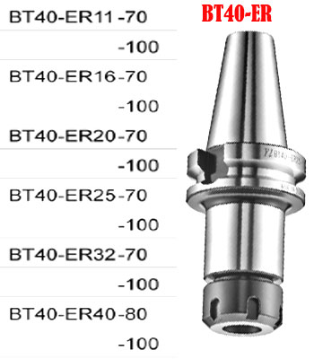 Đuôi cán BT40 chuẩn ER gồm các model BT40-ER11-70, BT40-ER11-100, BT40-ER16-70, BT40-ER16-100, BT40-ER20-70, BT40-ER20-100, BT40-ER25-70, BT40-ER25-100, BT40-ER32-70, BT40-ER32-100, BT40-ER40-80, BT40-ER40-100.