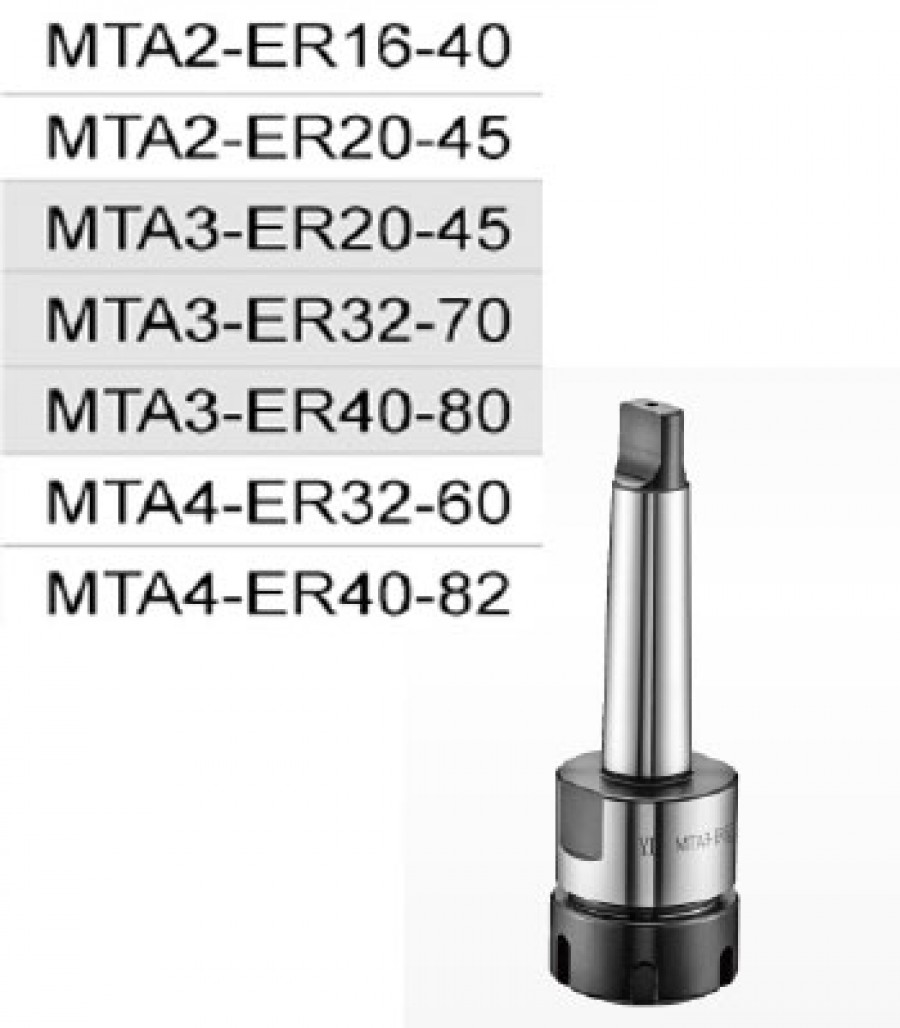 Đuôi côn loai MTA -ER gồm có các model MTA2-ER16-40, MTA2-ER16-45, MTA3-ER20-45, MTA3-ER32-70, MTA3-ER40-80, MTA4-ER32-60, MTA4-ER40-82 (lưu ý mổi ER sẻ có các loại Collet khác nhau, phần này người dùng có thể mua lẻ từng Size khi có yêu cầu).