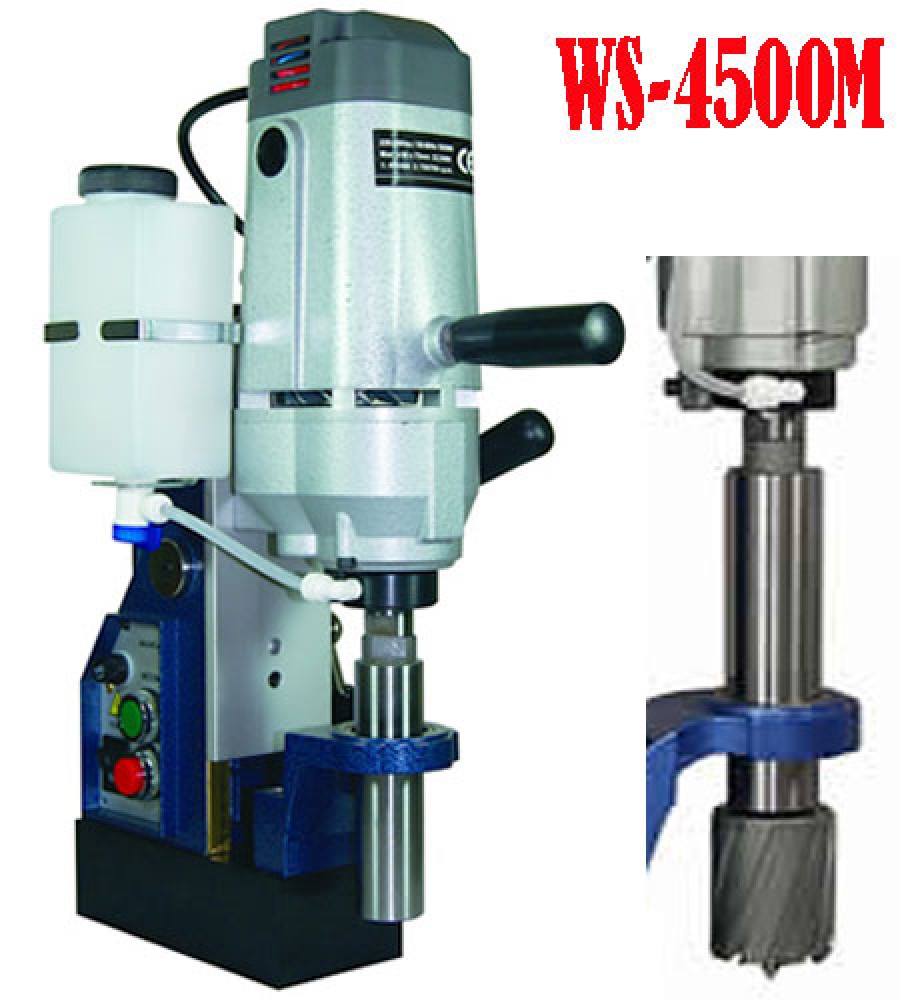 Khoan từ Đài Loan WS-4500M Wind Speed Miyanachlà loại tầm trung 1850W cho phép khoét lỗ sâu 50mm với các đường kính 45mm, 44mm, 42mm,40mm, 38mm, 36mm, 34mm, 32mm, 30mm, 28mm, 26mm, 24mm, 22mm, 20mm, 18mm, 16mm, 14mm, 12mm.