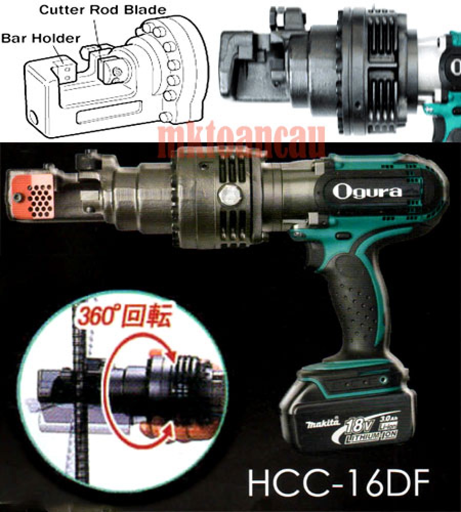 Máy cắt sắt cầm tay dùng Pin HCC-16DF HCC-13DF, HCC-19DF Ogura Nhật, chuyên dùng cắt các loại sắt xây dựng 16mm 15mm 14mm 13mm 12mm 11mm 10mm 8mm 6mm 4mm. Thời gian cắt 4 giây, trọng lượng 6.5Kg kể cả Pin nên thuận tiện khi làm việc trên cao.