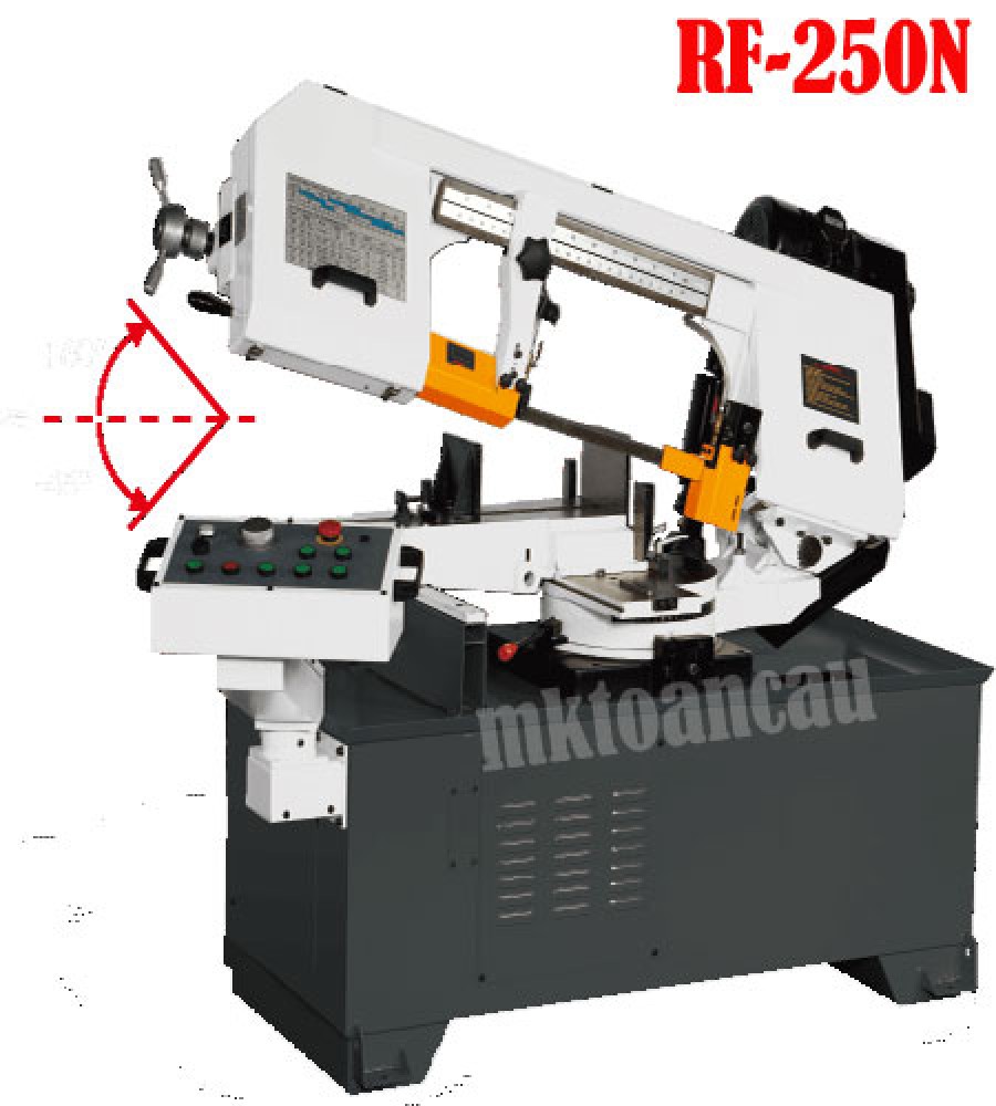 Máy cưa nằm ngang 2Hp RF-250N Rongfu Đài Loan Cắt tròn 254mm, cắt thép hình chữ nhật 76x458mm, 254x280mm, 254x254mm. Máy thiết kế vận hành Manual, nâng khung cưa bằng tay, hạ khung cưa bằng thủy lực, có vale điều tiết tốc độ hạ nhanh hay chậm thích ứng với vật liệu.