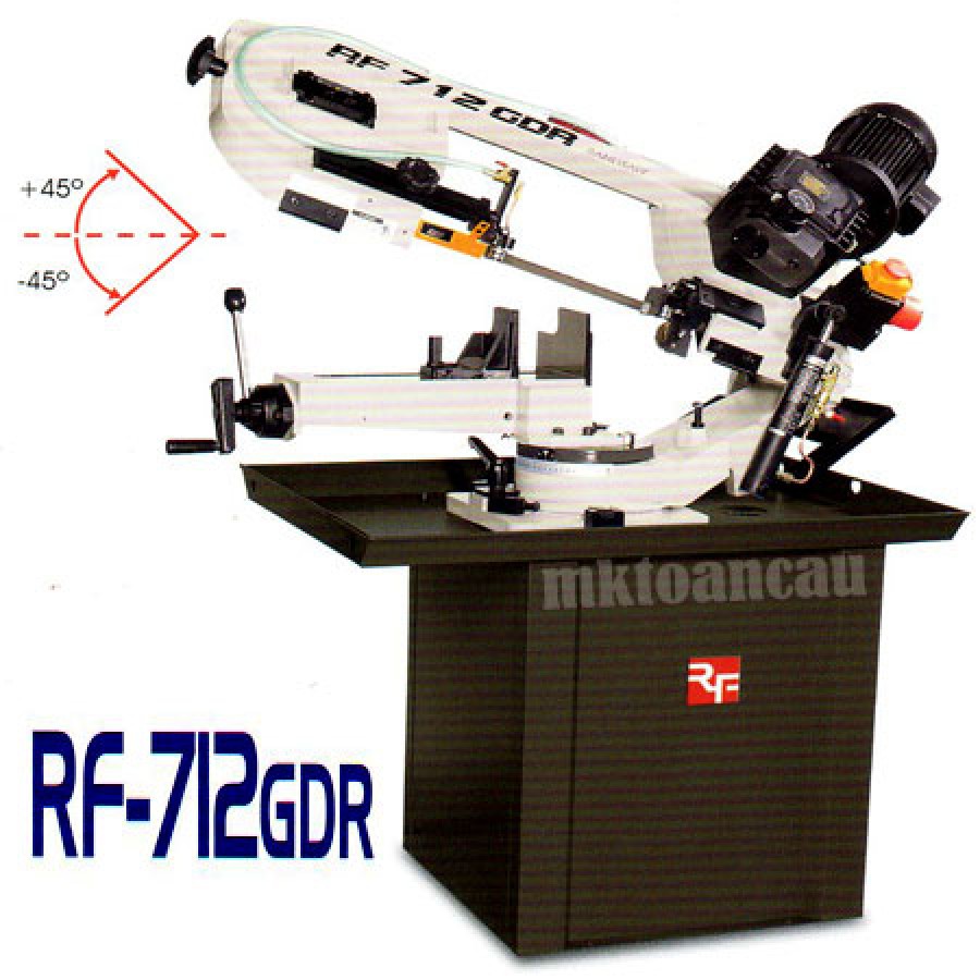 Máy cưa vòng 1HP RF-712GDR Rongfu Đài Loan là máy cưa kim loại thiết kế kiểu nằm ngang, công suất 1HP truyền động kiểu bánh răng hộp số 3 cấp tốc độ. Khả năng cắt sắt trụ 178mm, sắt hộp chũ nhật 178x210mm. Máy cho phép cắt Inox, sắt, thép trung bình, thép ống, cắt góc 45 độ theo 2 chiều trái phải.