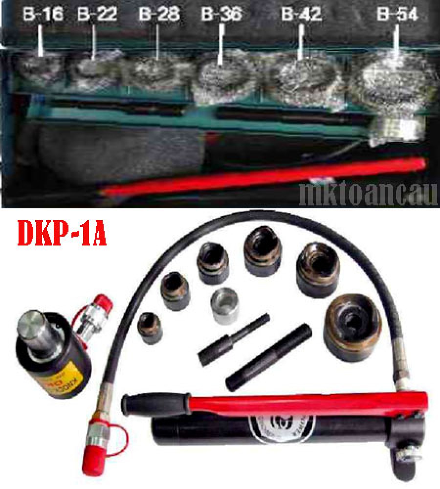 Máy đột lỗ tôn DKP-1A Hàn Quốc có trang bị sẳn các bộ khuôn tiêu chuẩn B-16 (22mm), B-22(28mm), B-28(36mm), B-36(42.7mm), B-42(48.7mm), B-54( 60.5mm). Vật liệu cần đột phải khoan lỗ trước khi lắp khuôn vào.