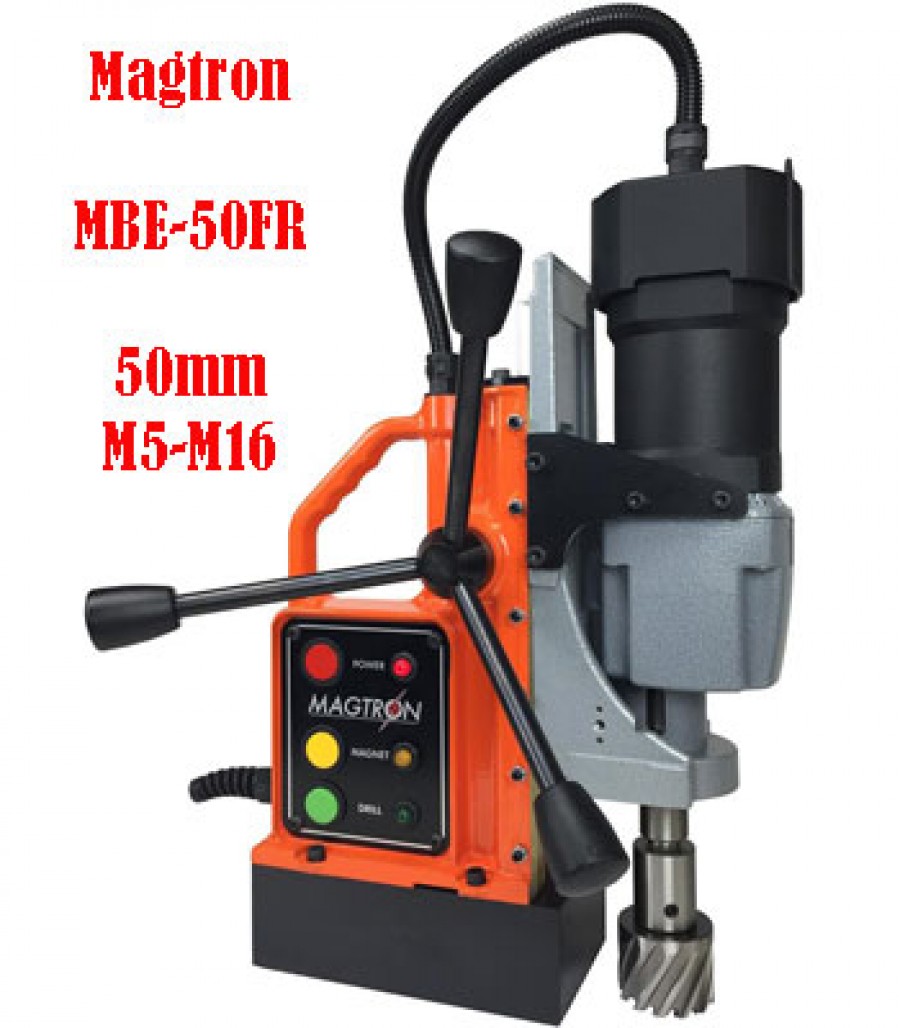 Máy khoan đế từ có ta rô MBE-50FR Magtron Anh Quốc công suất 1100W dùng điện áp 220V điều khiển tốc độ kết hợp giữa 2 cấp số cơ và mạch điện tử. Motor quay được 2 chiều thuận và nghịch, đáp ứng nhu cầu ta rô.