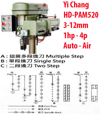 Máy khoan dùng hơi 12mm 4 tốc độ HD-PAM520 Yi Chang Đài Loan là loại khoan bàn thiết kế đặc biệt với hành trình khoan được điều khiển bằng hơi khí nén. Hành trình khoan có thể chia ra nhiều lần, điều này giúp lỗ khoan chính xác hơn.
