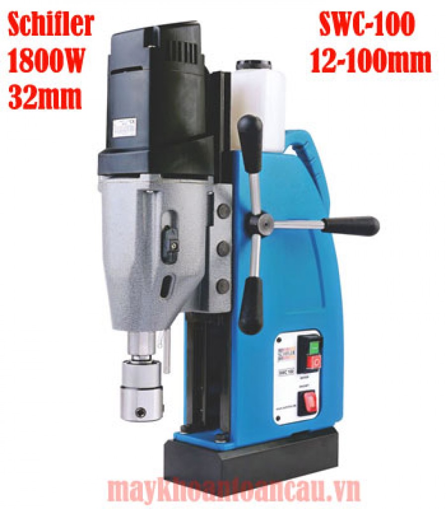 Máy khoan từ 1800W 100mm SWC-100 Schifler được thiết kế theo kiểu dáng công nghiệp, trọng lượng 25Kg thích hợp dùng khoan lỗ trên các loại thép tấm, dầm kèo, các bảng mã kim loại, dùng mũi khoan từ, mũi cắt răng cưa 12-100mm, mũi khoan xoắn 32mm.