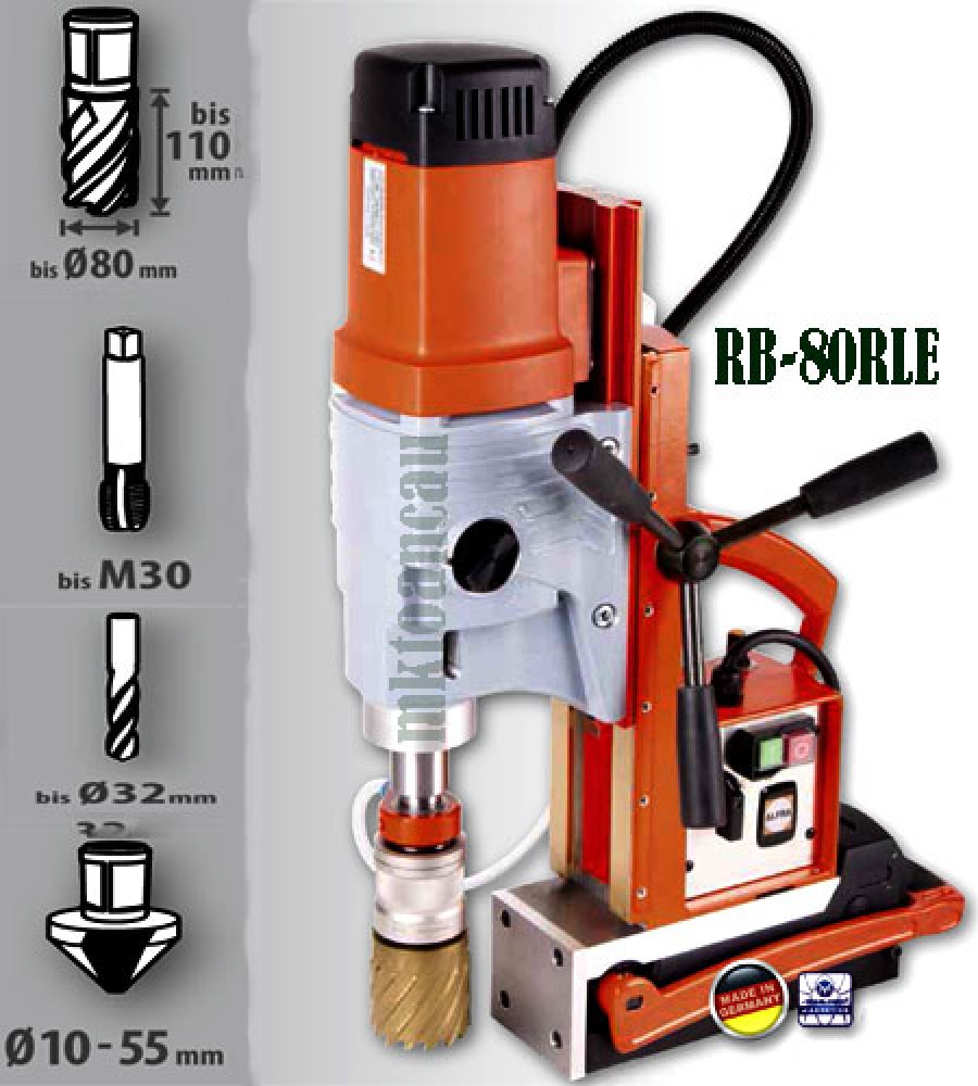 Máy khoan từ có taro RB-80RLE (RB-80SPRL) là loại khoan từ công suất lớn do Alfra Đức (Germany) sản xuất. Máy thiết kế đặc biệt dùng đế từ vĩnh cửu (Permanent magnet) thay cho loại đế từ điện (Electromanet) thông thường. Cho phép làm việc trên vật liệu mỏng, hoạt động liên tục mà không sợ cháy đế từ.