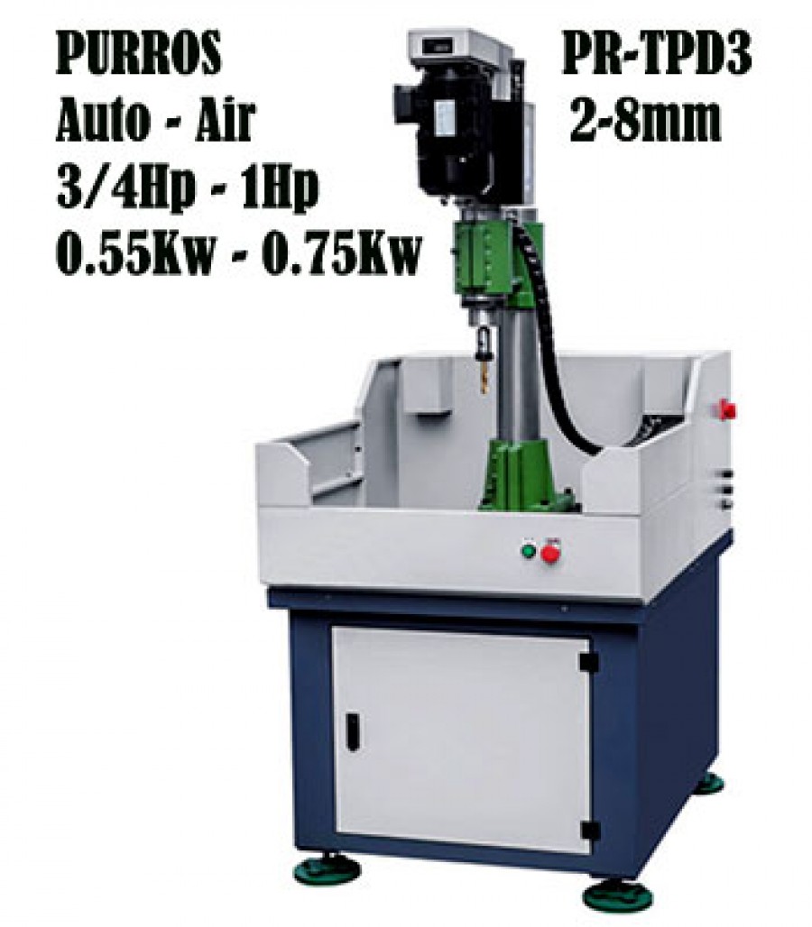 Máy khoan tự động 8mm dùng hơi PR-TPD3 Purros vận hành tự động bằng nguồn điện và hơi kết hợp). Đặc biệt chân máy thiết kế dạng khối hộp, và có thiết kế vách ngan xung quanh, thích hợp cho việc khoan lỗ vật liệu cứng có dùng nước làm mát.
