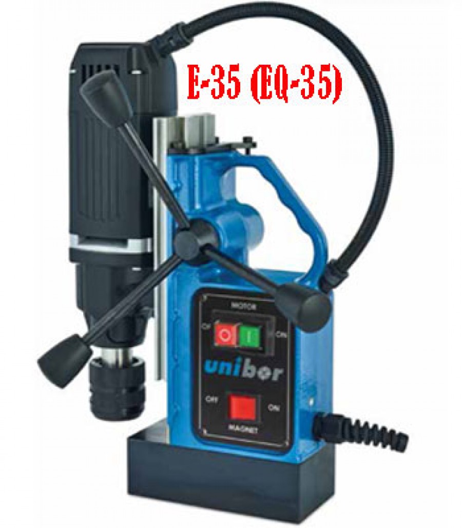 Máy khoét lỗ kim loại mini E-35 (EQ-35) Unibor Anh Quốc công suất 1100W với 1 cấp tốc độ, dùng được mũi khoan từ hợp kim và thép gió với chuẩn khoét sâu 25mm, 35mm, 50mm, sử dụng kiểu mũi đuôi 2 vát, 3 bi 1 vát (mũi khoan từ đuôi đa năng).
