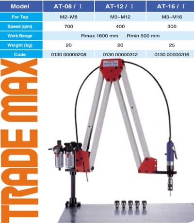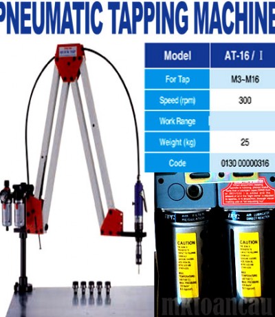 Máy ta rô cần dài AT-16/II Maho Trademax Đài Loan, bán kính làm việt từ 0,2-1,9 mét tính từ trụ máy. Khả năng ta rô tốt nhất trên vật liệu kim loại, nhực từ M2, M3, M4, M5, M6, M8, M9, M10, M11, M12, M13, M14, M15, M16. Motor khí nén dùng loại 1 tốc độ 300v/p.