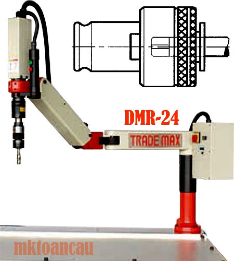 Máy ta rô cần DMR-24 Trademax Đài Loan, bán kính làm việc phạm vi từ 250mm-1100mm nên còn gọi là máy ta rô loại cần ngắn để phân biệt với loại máy ta rô cần dài (1900mm). Máy thích hợp ta rô trên các bản mã, chi tiết máy có phạm vi làm việc gần, trụ máy cho phép di chuyển.