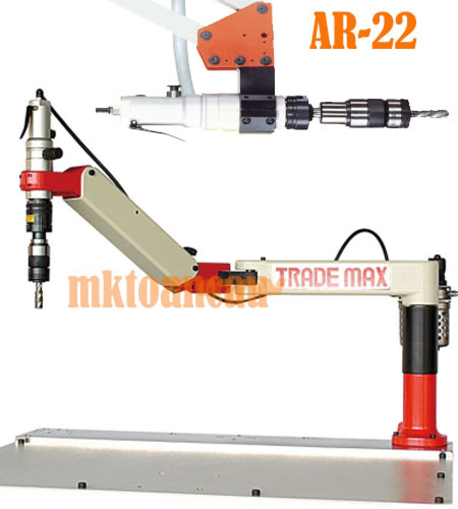 Máy ta rô cần M3-M22 AR-22 Trademax Đài Loan là loại máy ta rô dùng hơi khí nén. Motor được lắp trên cần cho phép di chuyển trong phạm vị bán kính 0,25-1,1m. Máy cho phép ta rô với nhiều góc độ khác nhau (Op), trục chính lắp mũi ta rô thiết kế kiểu lắp nhanh.
