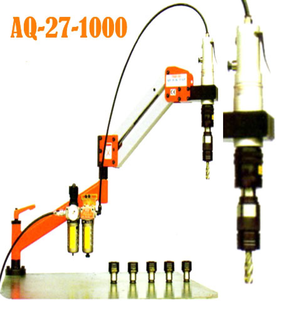 Máy ta rô dùng hơi AQ-27-1000 Trademax Đài Loan, là loại ta rô cần khí nén chuyên dùng ta rô kim loại trên mặt phẳng rộng. Bán kính cần điều chỉnh cho phép từ 100-1000mm tính từ chân trụ thiết bị. Cho phép ta rô trên hầu hết kim loại như Nhôm Đồng, Gang, thép, Inox....