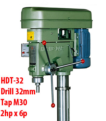 Lưu ý rằng trên model HDT-32 có một chi tiết đặc biệt là trục chính được tăng cường truyền động kiểu bánh răng (gear type) cho phép tạo Moment xoắn lớn, điều này giúp quá trình khoan và ta rô được dễ dàng hơn (ít bị trượt như loại dây cu-roa).