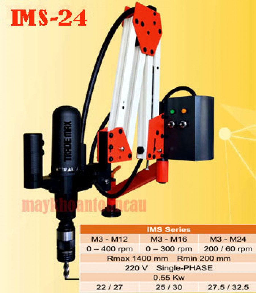 Máy ta rô M3-M24 kiểu cầm tay IMS-24 Đài Loan là loại taro dùng điện, động cơ 0.55Kw/220V/ 1p. Điểm đặc biết là Động cơ được lắp trên một giá cần và cho phép di chuyển trong phạm vi rộng với bán kính 1400mm, thích hợp gia công chi tiết lớn.