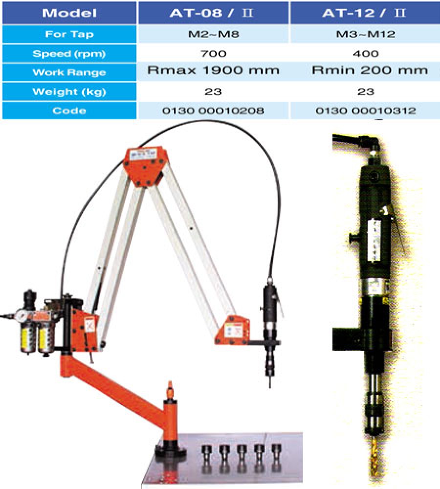 Máy taro cần AT-12 (AT12-II), AT08, AT16, AT20, AT22, AT24 Trademax Đài Loan, loại dùng hơi khí nén cần dài 200mm-1900mm, khả năng taro M12 M10 M8 M6 M5 M4 M3 M2. kèm theo 6 Collet. Máy cho phép taro góc nghiêng, góc 90 độ, taro trên mặt phẳng rộng.
