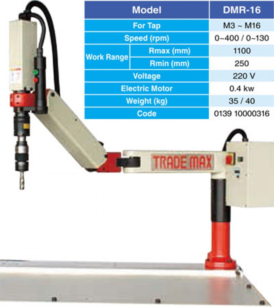 Máy taro cần dùng điện DMR-16 Trademax Đài Loan, công suất 400W, phạm vi cần 250mm-1100mm. Máy sử dụng Motor điện thay cho loại Motor khí nén, Motor dùng điện 220V, điều khiển tốc độ vô cấp từ 0-60v/p và 0-300v/p. Máy có thời gian taro nhanh, ứng dụng nhiều trong sản xuất công nghiệp, linh kiện, phụ tùng.