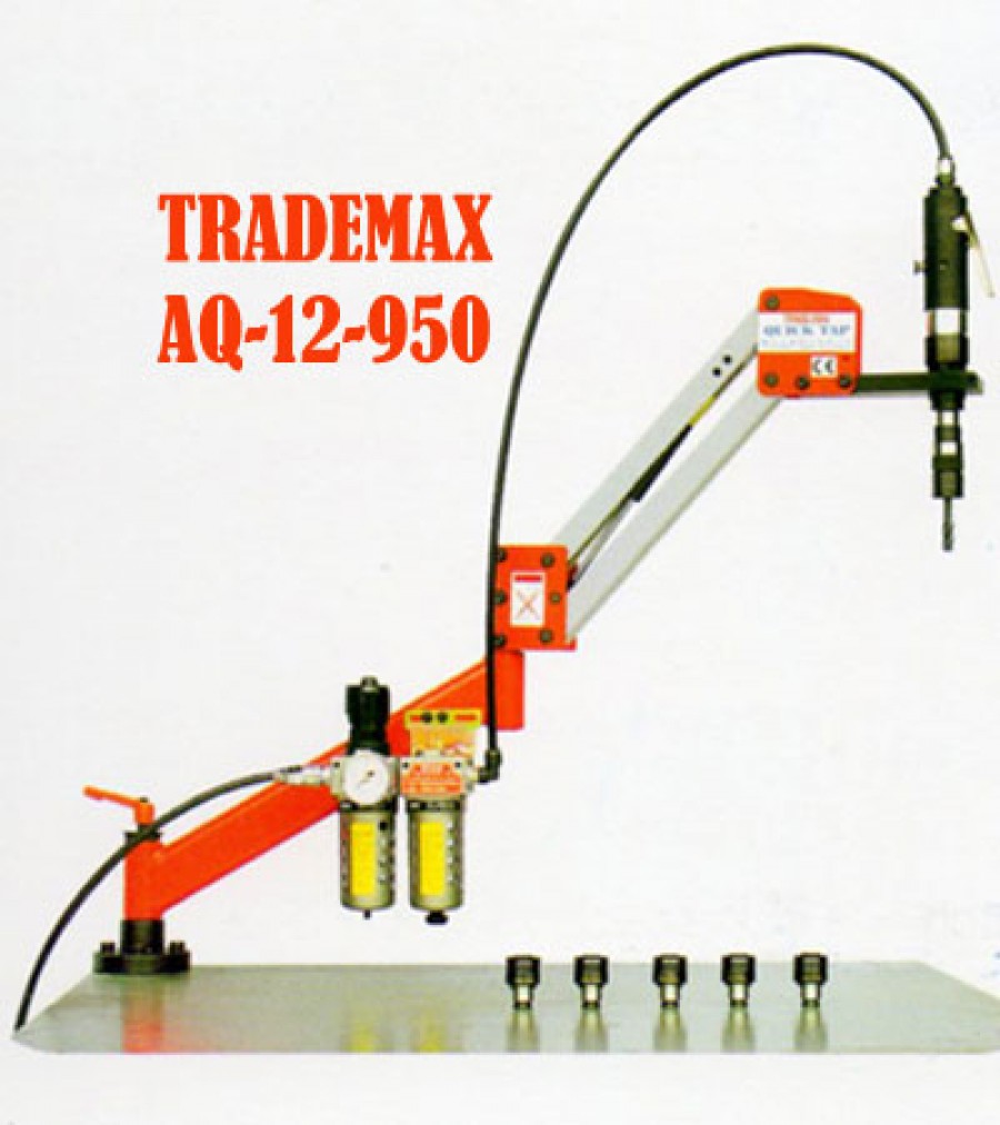 Máy taro cần khí nén AQ-12, Trademax Đài Loan, taro M3-M12 trên vật liệu Nhôm, sắt và Inox. Bán kính làm việc max 950mm và min 100mm, cho phép lắp trên bàn cố định, bàn làm việc di động hoặc trên đế từ vỉnh cửu.