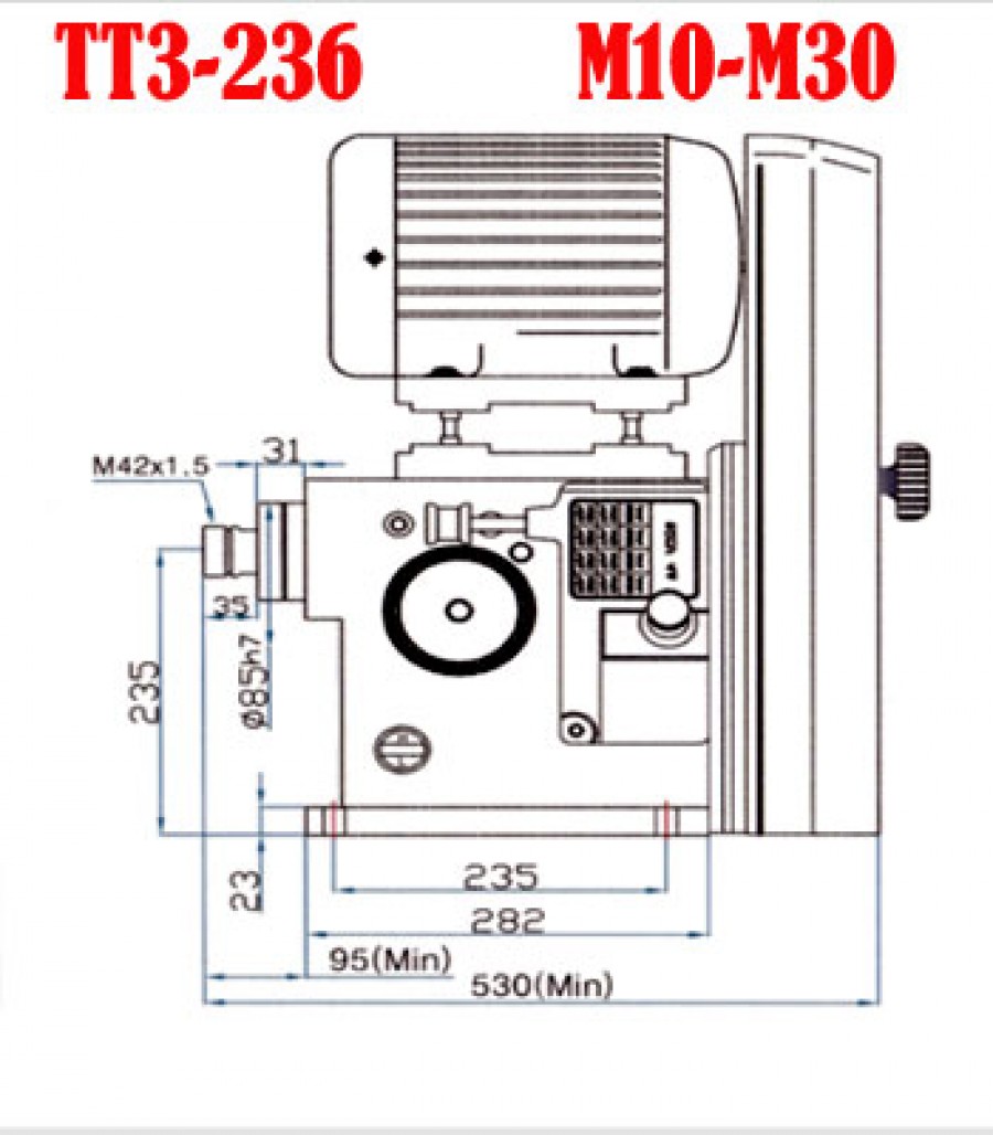 Máy taro M10-M30 TT3-236 trang bị Motor AC công suất 2HP loại 6 cực (6p) với tốc độ chậm. Máy truyền động 3 cấp tốc độ bằng Pully (50Hz) 50-100-200v/p. trong trường hợp người dùng cần kiểu tốc độ vô cấp Pulley hoặc Inverter thì phải đặt riêng.