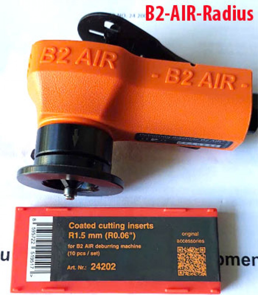 Máy vát cạnh R mini B2-AIR (FE Powertools) là thiết bị dùng vát các mép cạnh kim loại với góc vát 450 hoặc R1.5mm. Máy sử dụng chung đài dao cho Chip cắt 450 và chip cắt R1.5mm. Trên đài dao có 2 chip cắt ( 2 lưỡi dao cắt trên một đài dao).